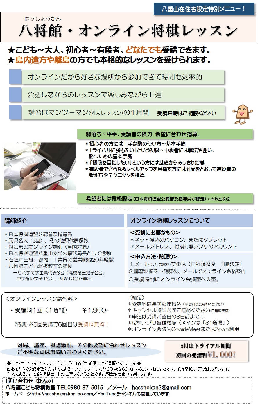 館長です。7月は台風もありましたが、例年に比べればまだ今年は少ないです。まあいつもの熱い夏です。 石垣島のいつもの夏。街中は観光客で溢れ‥ん?、あふれてませんね。仕事終わりの週末は仲間と居酒屋で一杯・・?居酒屋は軒並み閉まっていますな。さあ夏といえば将棋大会!‥あ、延期&中止ですか、そうですかぁ・・・。とまあ、今年もいつもの夏は過ごせそうにありませんが、頑張っていきましょう。 (7月の昇級) ・・・・・ 昇級者はありませんでした。 先月、数名まとめて昇級したので、今月なしは仕方なしですかね。 トピックも特にありませんが、教室の様子など。 6月の中学女子県大会優勝の桃香さん。8月の全国大会へ向けて、7月はレッスン日を増やして特訓中。上がったり下がったりを繰り返しながらも着実に進歩。まだまだ粗さが目につきますがそれもまた彼女の魅力の一つ。伸びしろたっぷり、ってことです。本人気づいていないでしょうがちゃんと地力は向上中、努力した分の成長はみられます。 全国大会ではまずは1勝を!、できれば予選通過…運も味方にで更に勝利を‼(笑)。まあ初めての全国大会なので楽しんできてくれたらと思います。ライバル・友人ができるといいね。 全国の舞台を経験し、さらに成長してくれることでしょう。 (案内) Facebookでは既に案内しておりますが、8月より「八将館オンラインレッスン」を開始します。 対象は八重山在住者で将棋が強くなりたい、学びたい方。子供から大人までどなたでも、年齢・棋力不問です。 詳しくはお問い合わせください。(詳細は下↓のポスター参照) ※八重山地区以外で受講希望の方は「ねこまどオンラインレッスン」からの受講をご検討ください。 しかし‥一年前は「来年も状況変わっていない」とは思いもしなかったですね。まだ暫く厳しい状況が続きそうですが、頑張って乗り越えていきましょう。 以上、7月の教室の様子でした。 (八将館オンラインレッスン案内)